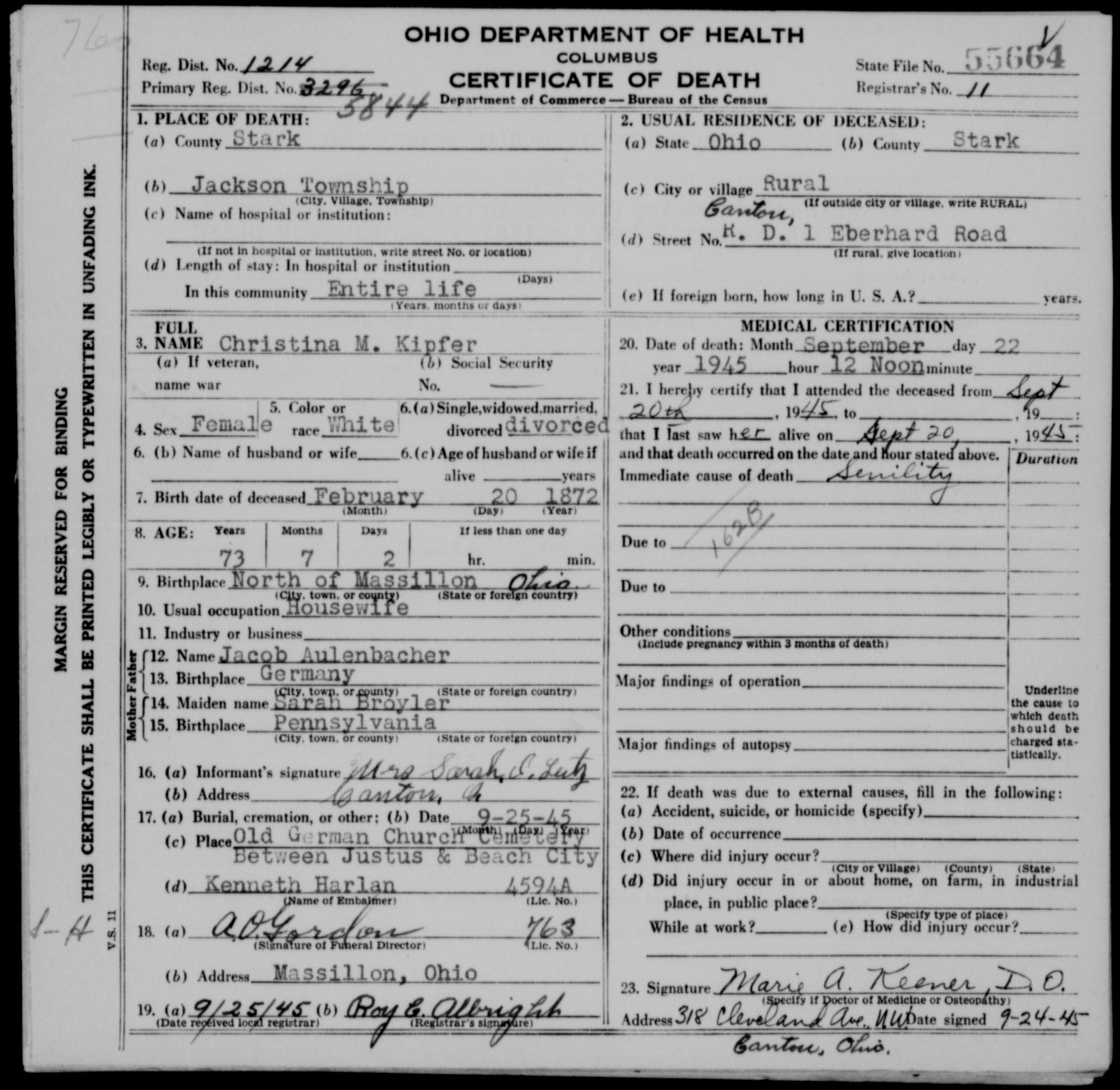 Death - 1945, Christina M Aulenbacher