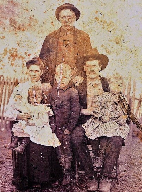 Jessie and Flora Hawkins Brookover Family - 1909 Front, left to right: Flora Hawkins Brookover, Bonnie Brookover (on Flora's lap), Lester Brookover, Jessie Brookover, Cora Brookover (on Jessie's lap); Back: John Brookover (father of Jessie). (Photo Courtesy of Ernest and Bertha Brookover Hosey) |