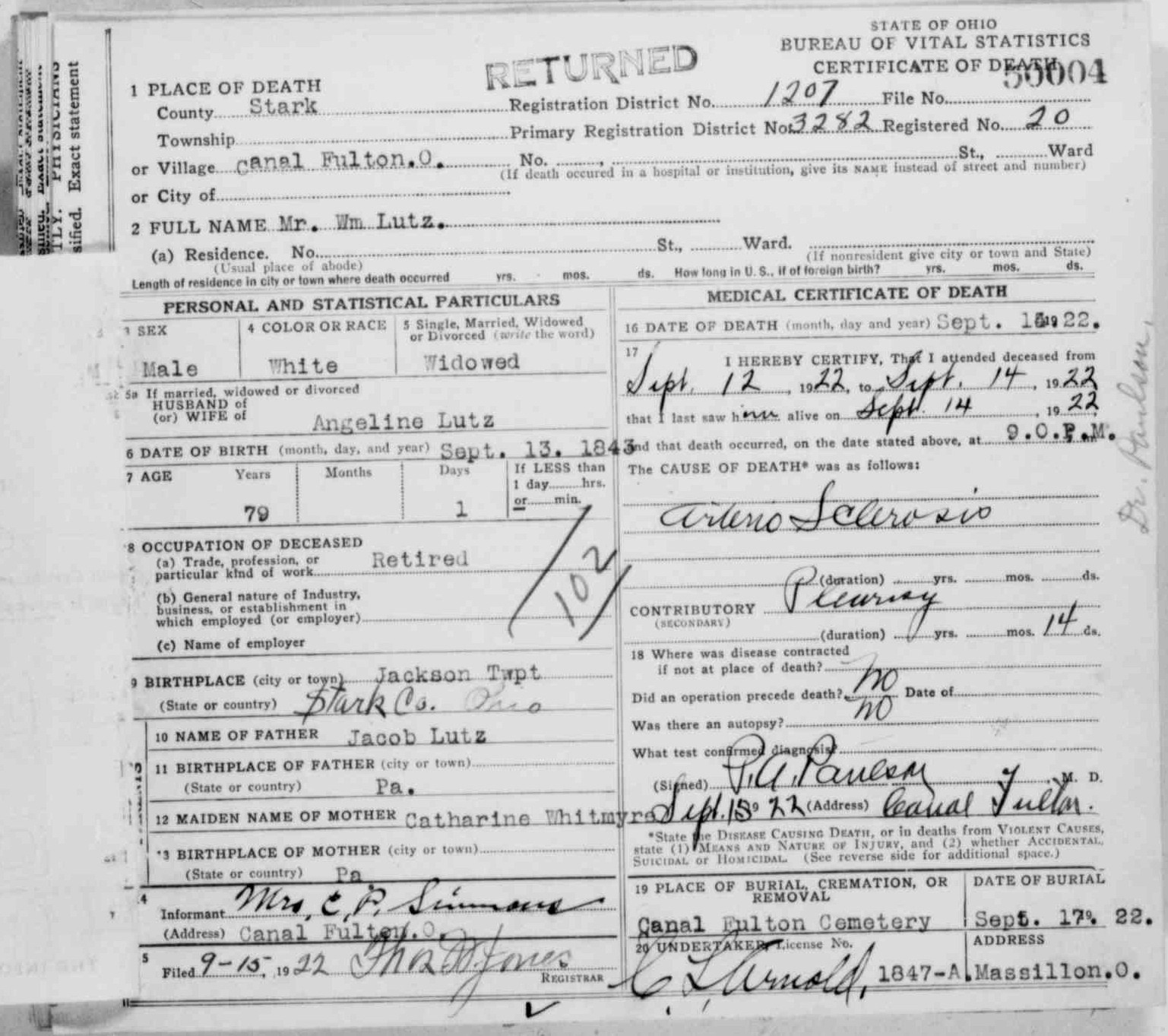 Death – 1843, Ohio Death Card, Wm Lutz, Canal Fulton, Stark County, Ohio