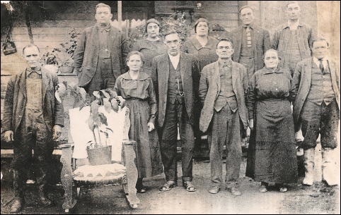 WALLBROWN FAMILY AT HENRY'S FUNERAL (1923) ON PANTHER RUN, BEECH Wife Elizabeth Mittendorf Wallbrown already deceased in 1906, the empty chair represents Henry; 1st Row: Michael, empty chair, Bertha (married to Godfry Fritz) Henry Jr., Frank, Clara and John; 2nd Row: Joseph, Elizabeth, Annie, Amos and William Henry (Hazel's father) Clara might be the skinny one holding the chair. Aunt Connie always remembered Clara as a really small skinny woman, but she could have lost a lot of weight in her old age. Aunt Rita and Linda confirm that Clara is the one that is in the front row, second from right. They also said Deceased Aunt Lena shown by the empty chair with the plant in front row, Not Henry. The others are arranged in the order of their births. |