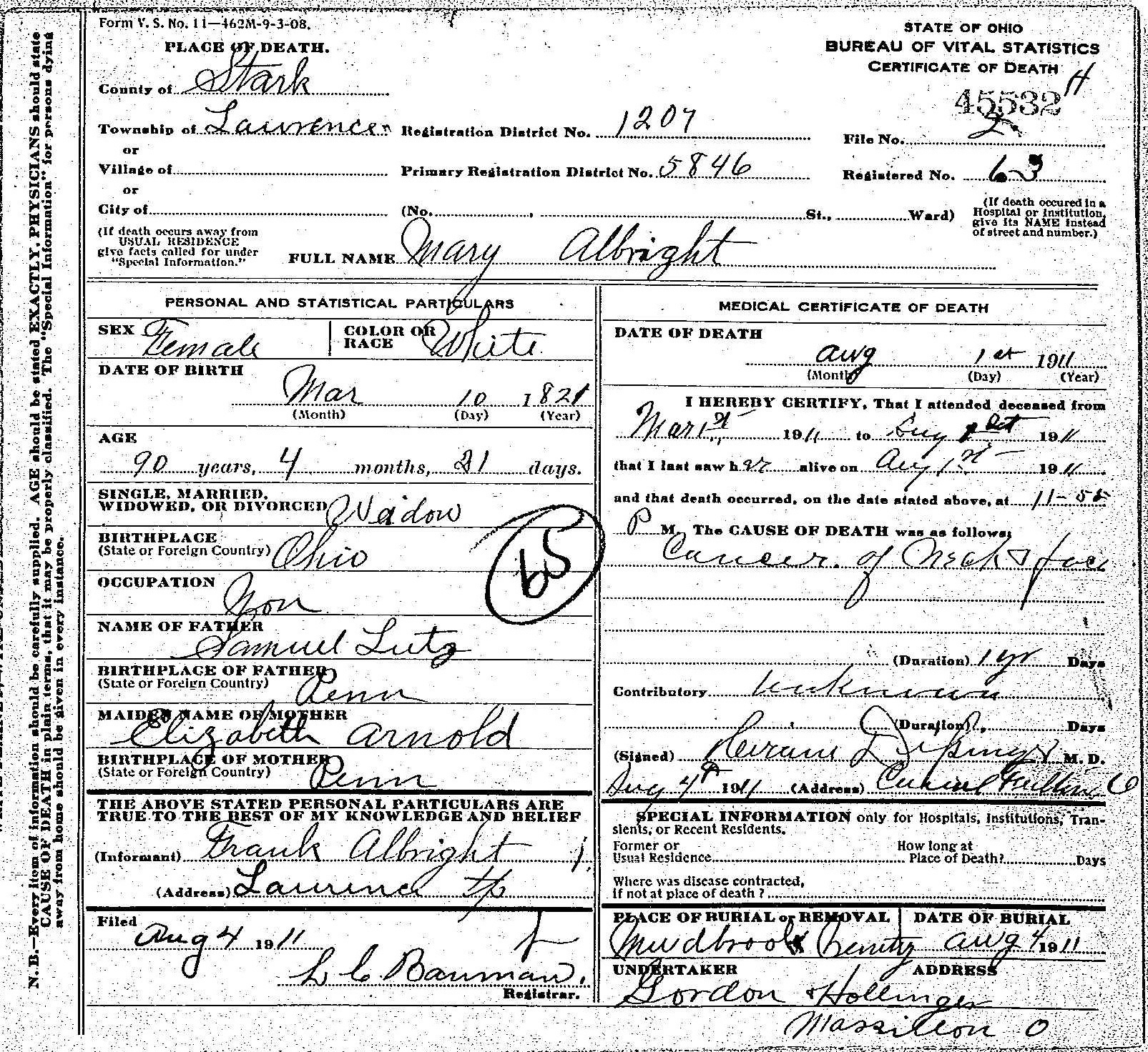Death – 1911, Ohio Death Card, Mary Lutz, Lawence, Stark County, Ohio