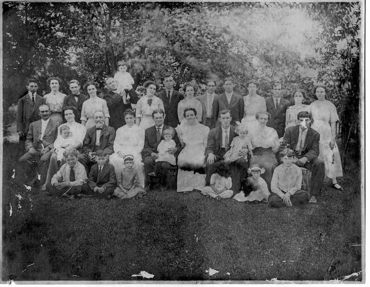 Taken in Ohio I think. About 1907 to 1910 First row on ground: Marion Emmet King, Henry Jay King, ?, ?, ?, ? Second row seated: ?, ? holding child, Gottlieb Eicher, Adelin Lennerr (sp), Jacob D. King holding ? child, Susan Katherine Eicher King, ? holding ?, ?, ? Third row standing: ?, ? Eicher, Arthur King, Lena Louella Eicher Harman, Frank Harman holding Donald Eicher Harman, ?, ?, ?, ?, ?, ?, ?, ?, Geraldine Lucille King. Children & grand children of GOTTLIEB EICHER and ADELIN LENNERR MARY EICHER. LENA LOUELLA EICHER. WILLIAM EICHER. WALTER EICHER. JACOB EICHER. ADOPH EICHER. JOHN EICHER. ELIZABETH EICHER. SARAH EICHER. ANNA EICHER, EMMA EICHER. SUSAN KATHERINE EICHER |