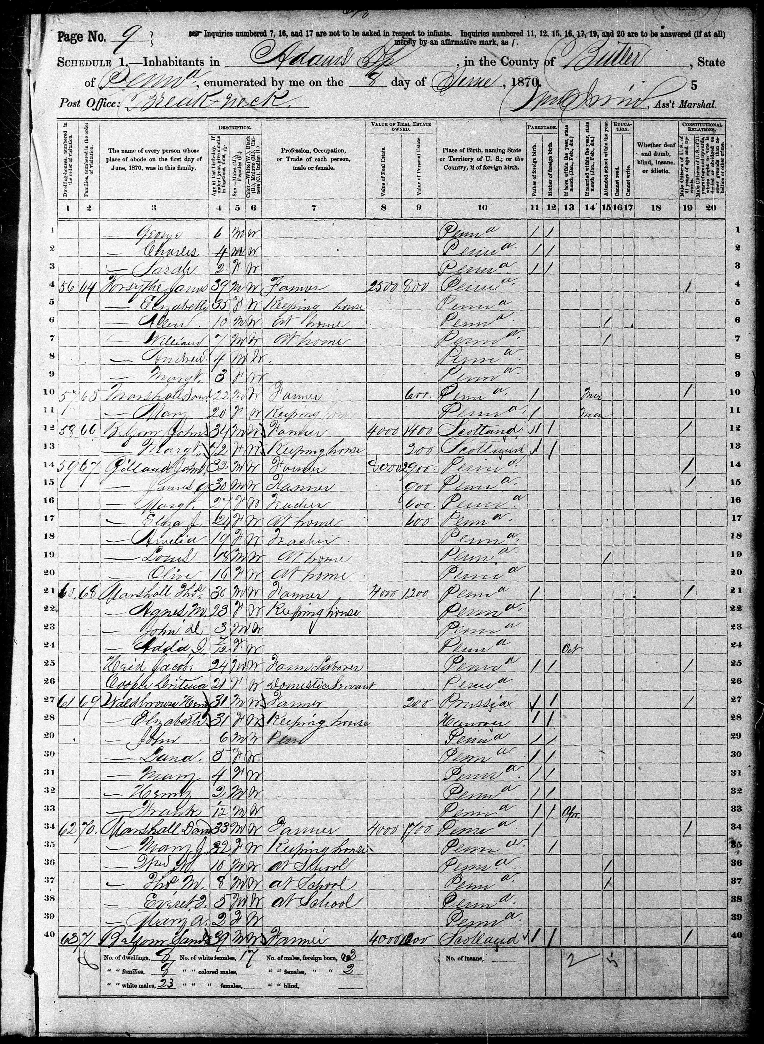 1870 US census, Henry Wallbrown Family, Adams Twp, Butler County, PA