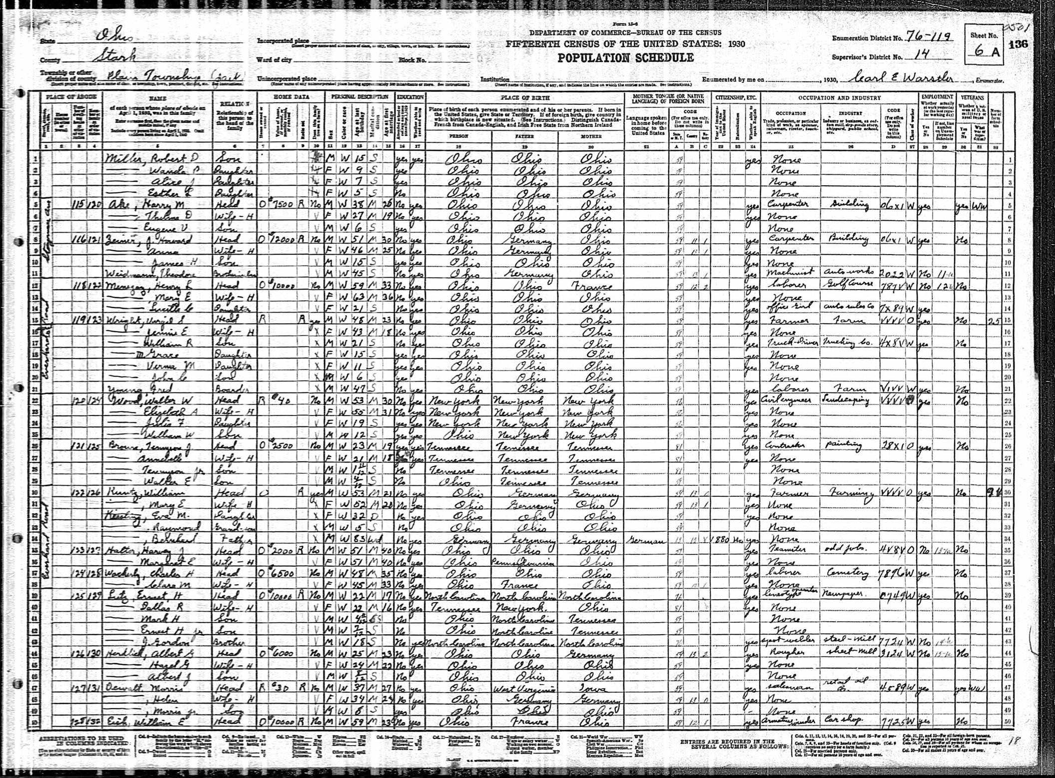 1930 US census, C. Frank Miller Family, Plain Twp, Stark County, Ohio, Enumeration District 76-119, sheet 5B & 6A
